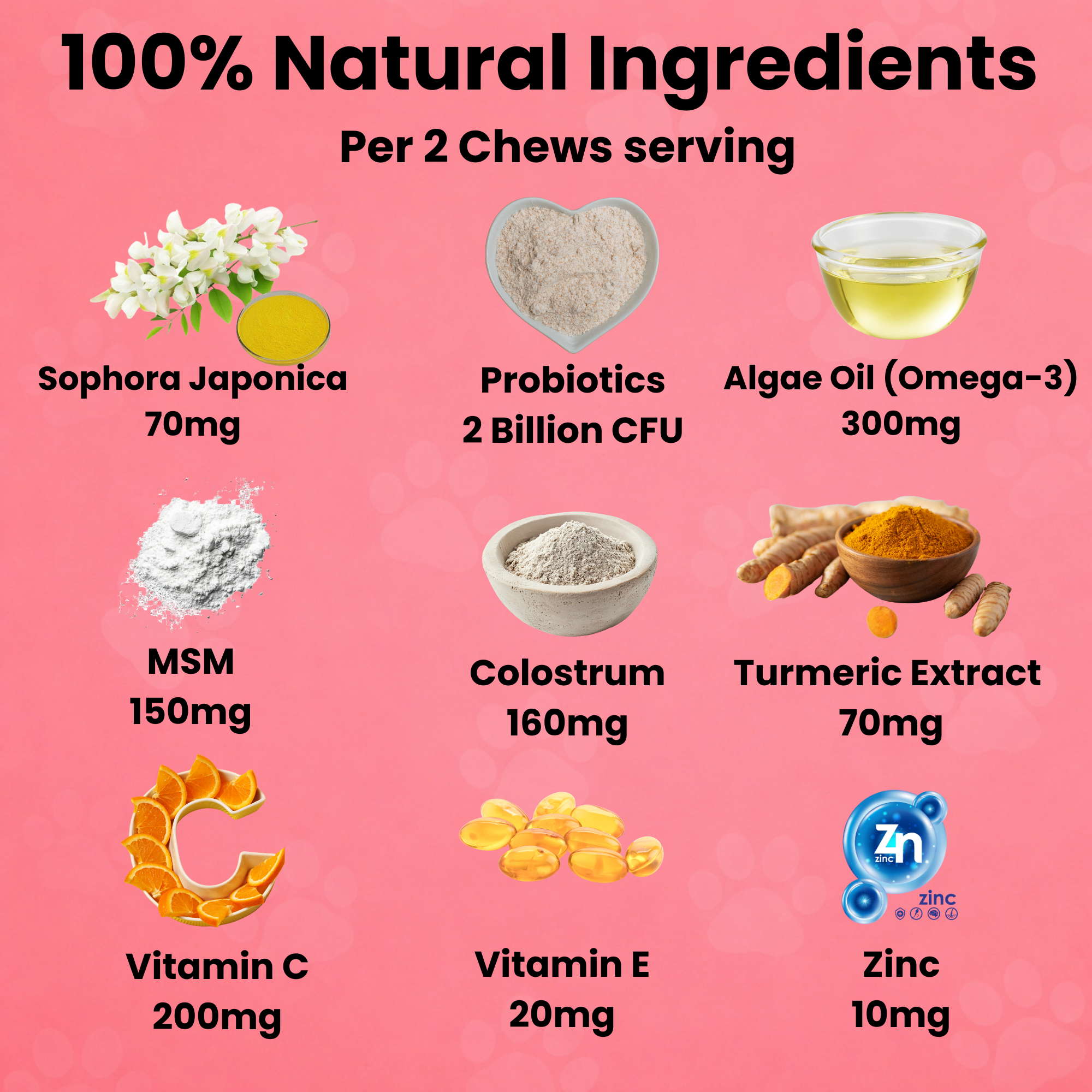 Per 2-chew serving: Algae Oil (Omega-3) 300 mg - Probiotics (Bacillus velezensis) 2 Billion CFU - Vitamin C 200 mg - Colostrum 160 mg - MSM 150 mg - Turmeric Extract 70 mg - Sophora japonica Extract (natural source of quercetin) 70 mg - Vitamin E 20 mg - Zinc Diglycinate 10 mg.