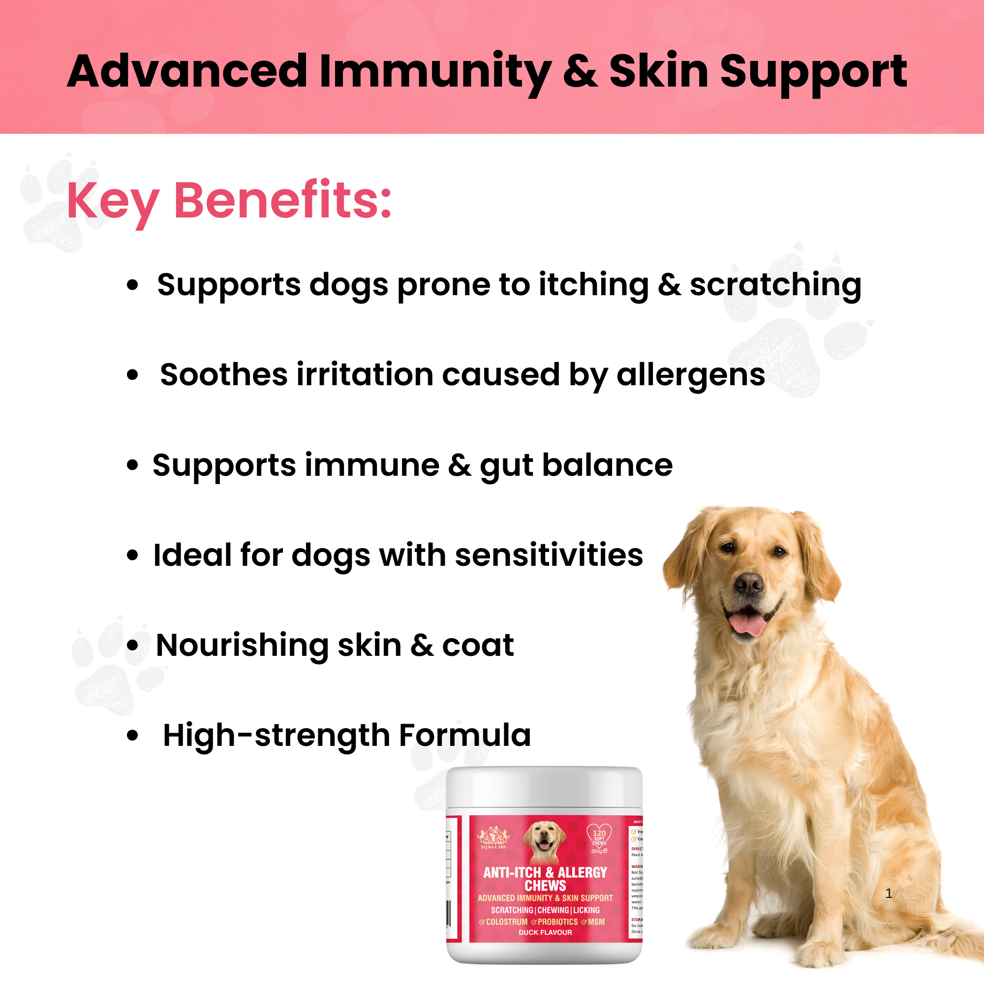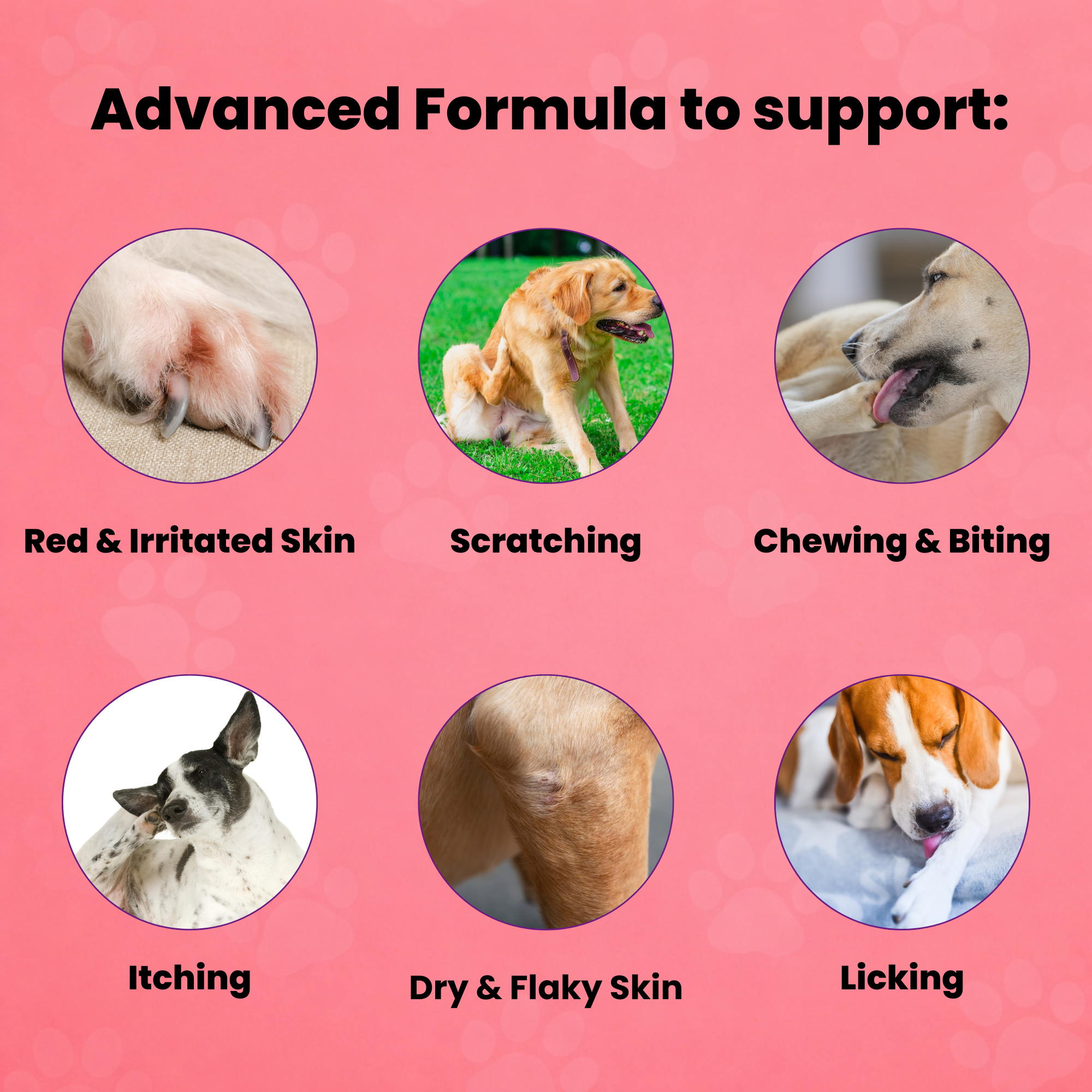 • Supports dogs with itching, licking, or allergies