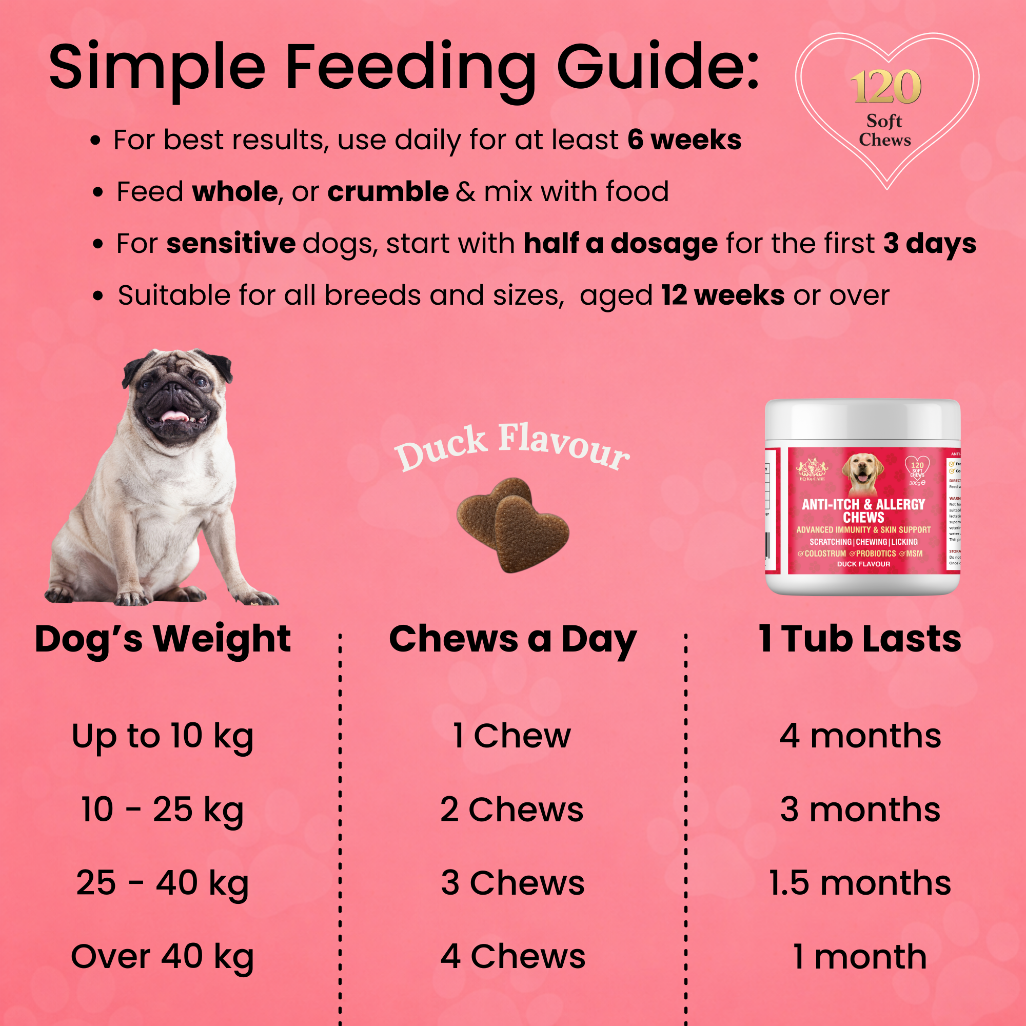Up to 10 kg: 1 chew/day • 10–25 kg: 2 chews/day • 25–40 kg: 3 chews/day • 40 kg+: 4 chews/day. Give the full daily amount at once.